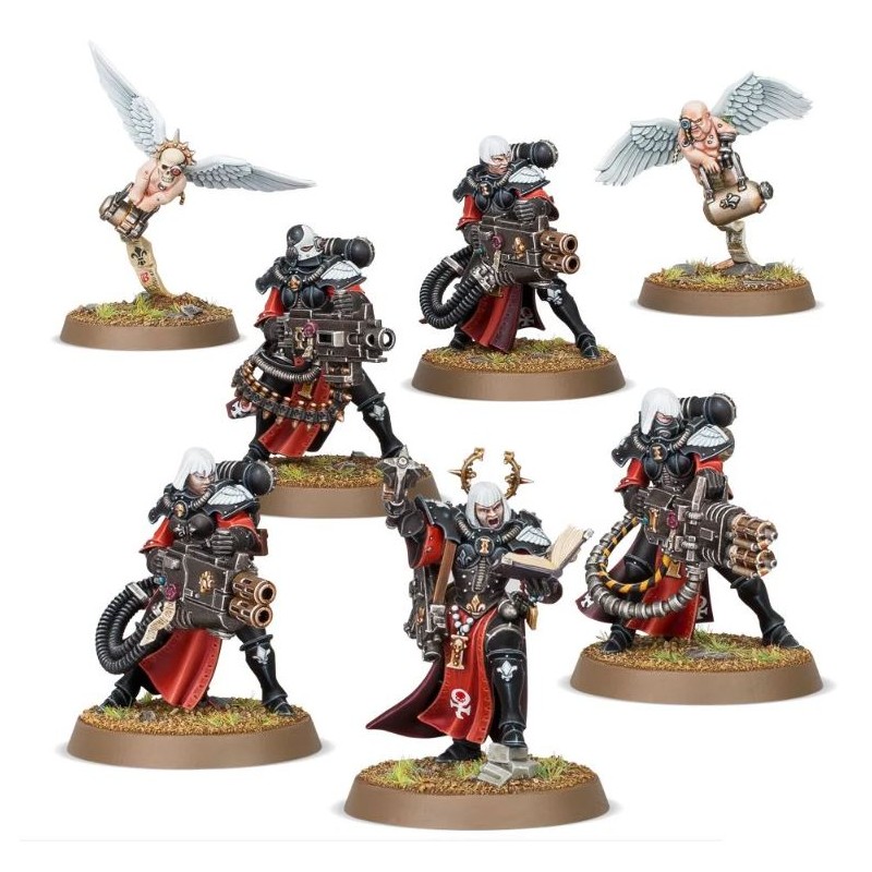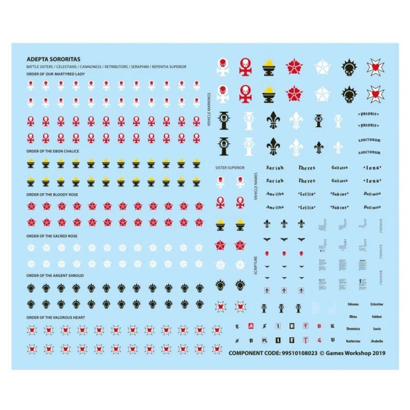 Ce kit est fourni en 115 composants plastique, plus 5 socles ronds Citadel de 32mm et 2 socles ronds Citadel de 25mm, ainsi qu'une planche de décalcomanies de l'Adepta Sororitas.