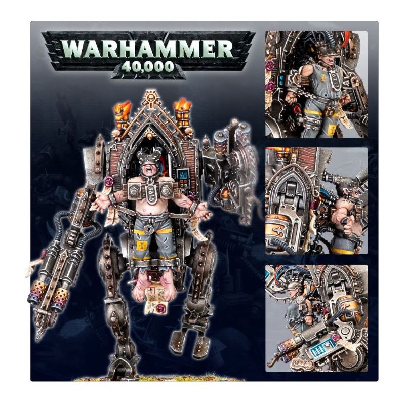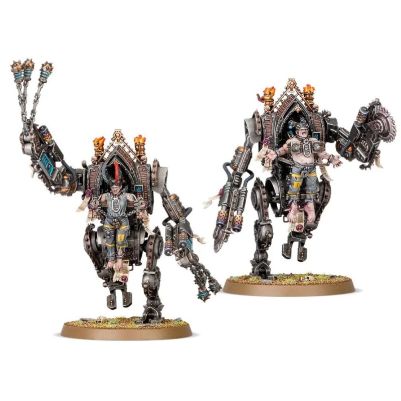 Description du produitLes Penitent Engines chargent l’ennemi sans se soucier du danger, car leurs pilotes savent que seule la mort, la leur ou celle de l’ennemi, peut leur apporter l’absolution. Les bras de ce genre d’engin sont équipés d’énormes lance-flammes qui crachent des langues ardentes alors qu’il avance implacablement. Lorsqu’il atteint l’adversaire, le cocktail chimique qui inonde les sens du pilote est modifié afin qu’ils aient l’impression que l’ennemi est à leur image. Ce dernier devient alors une réflexion insupportable du sentiment de culpabilité du pilote, qui s’y attaque sauvagement pour la faire disparaître de sa vue. Certains Penitent Engines sont dotés de scies circulaires aux dents en adamantium capables de découper le blindage d’un char, alors que d’autres broient les os et lacèrent la chair en abattant de lourds fléaux à plusieurs lests.