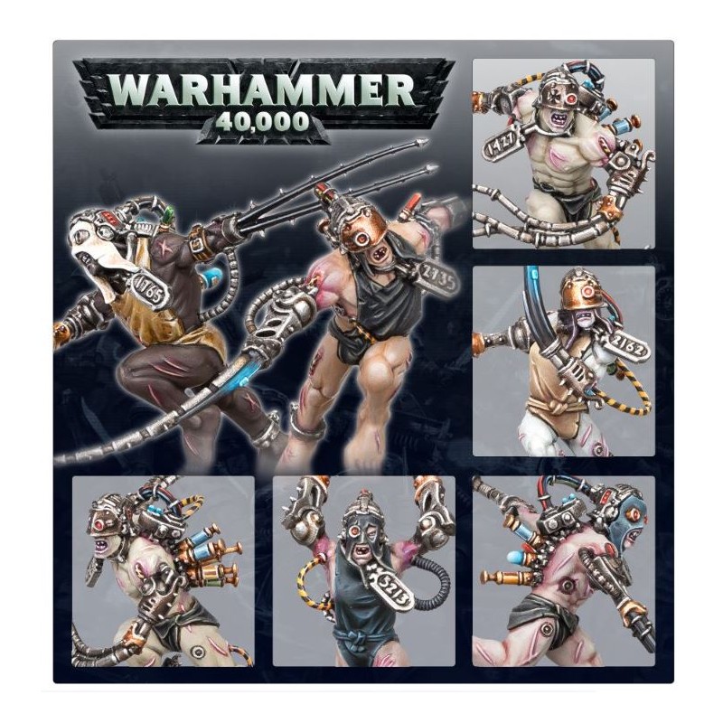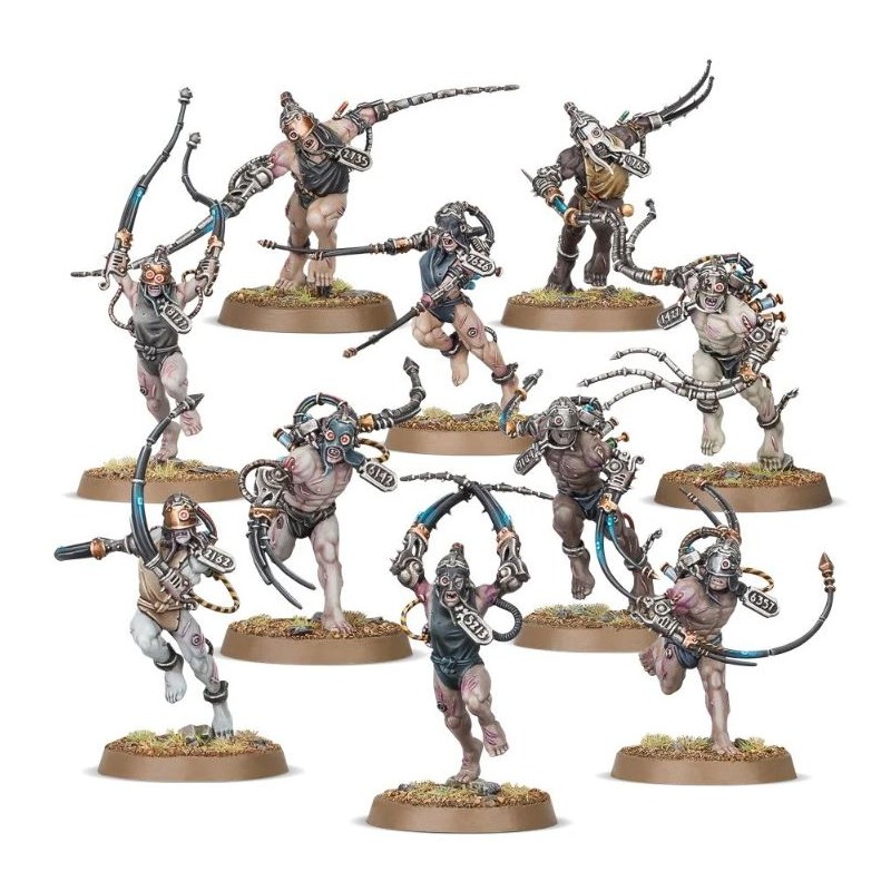 Description du produitLes Arco-flagellants courent en meutes aux côtés des armées des fidèles, en agitant férocement leurs bras terminés par des fouets ondoyants, sous les ordres de leurs officiers ecclésiastiques. Lorsque l’ennemi est en vue, ils sont plongés dans une rage aveugle par un puissant mélange de stimulants, puis ils se jettent au combat sans faire preuve de retenue quelconque ni du moindre instinct de préservation. Ils frappent avec leurs fléaux implantés, pioches pneumatiques et autres hachoirs jusqu’à ce que l’adversaire soit réduit en tas de cadavres mutilés.