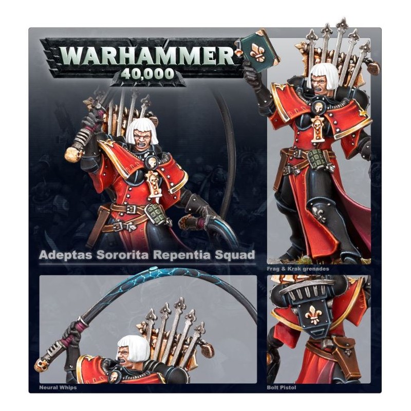 Description du produitLes Sœurs coupables de manquement au code de conduite draconien de leur Ordre sont exclues de celui-ci et privées de leur équipement. Appelées Repentias, ces fautives sont regroupées en escouades auxquelles on donne l’occasion de se racheter en versant le sang des impies. Il est possible à une Repentia de se racheter au prix d'une boucherie accomplie avec bravoure. Pour preuve, Célestine la Sainte Vivante fut elle-même une Repentia.