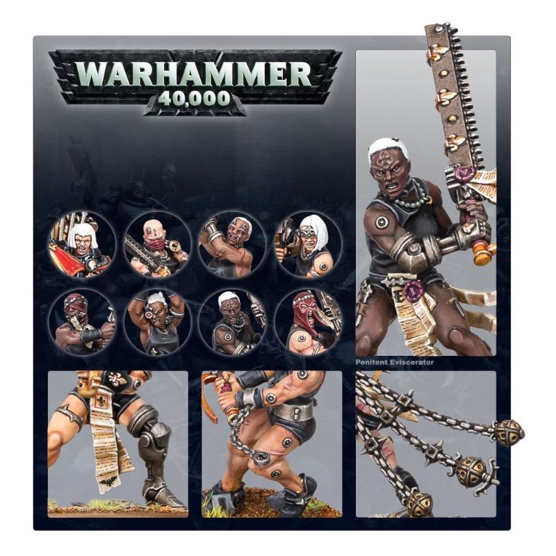 Le kit permet d'assembler neuf Repentia armées d'eviscerators de pénitent. Chaque corps dispose de deux paires de bras au choix pour plus de variété. La Repentia Superior manie une paire de fouets neuraux, l'un enroulé et l'autre en train de claquer, et on peut en replacer un par un tome béni. La Repentia Superior dispose d'ailleurs de deux têtes au choix (avec ou sans casque).