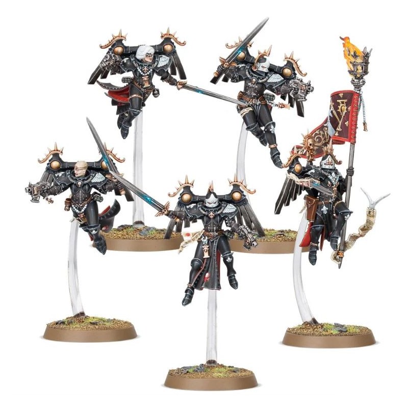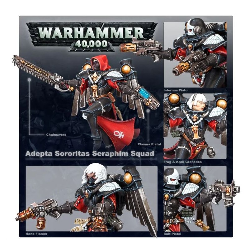 Les guerrières angéliques appelées Seraphim combattent à l’avant-garde des armées de l’Adepta Sororitas. Elles sont équipées de réacteurs dorsaux modèle San Leor, tombent du ciel et se jettent sur les lignes ennemies, se servant de l’effet de surprise et du choc pour disperser les formations adverses avant que les autres sœurs arrivent pour parachever la victoire. Chaque Seraphim manie une paire de pistolets choisis parmi la trinité des armes saintes. Les pistolets bolters crachent la mort tandis que les Seraphim filent dans le ciel. Les lance-flammes vomissent des torrents de feu qui immolent les ennemis en rangs serrés, alors que les pistolets Inferno tirent des faisceaux d’énergie capables de faire fondre la chair et le métal avec une facilité déconcertante.