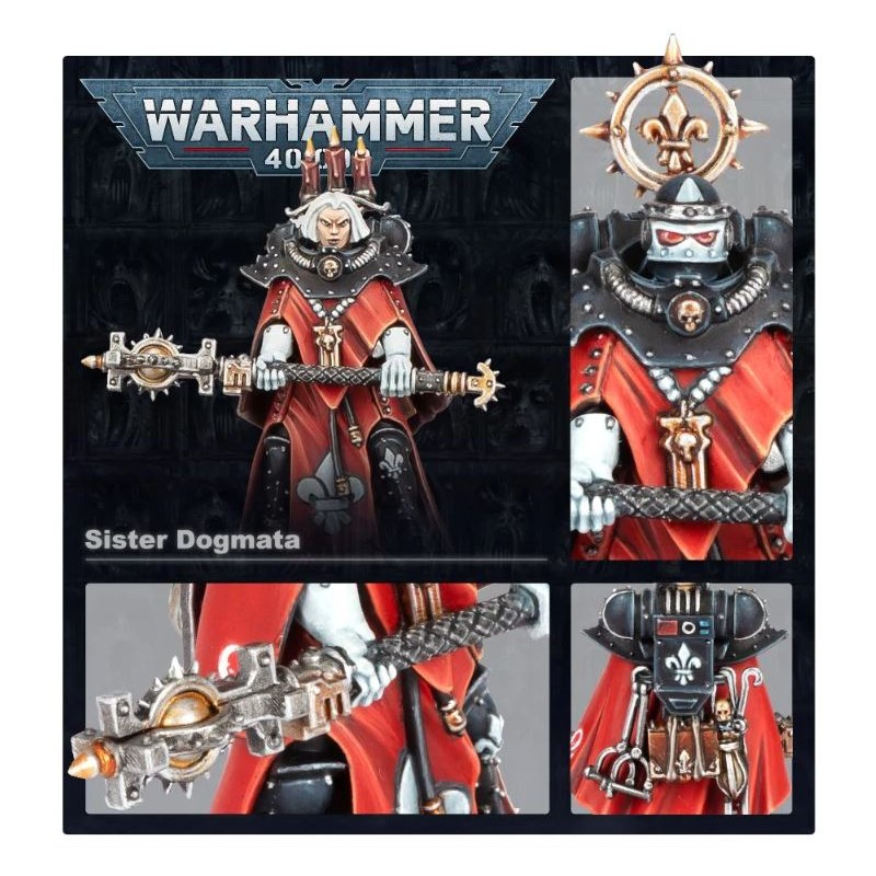 Fournissant une assise solide pour exhorter ses Sœurs de Bataille à se battre, la Sœur Dogmata est un puissant Personnage de soutien dont la seule présence démultiplie les forces autour d'elle. Quand un regard furieux ne suffit pas, elle entonne des hymnes guerriers sacrés et défonce le crâne de ses ennemis à grands coups de sa masse du juste.