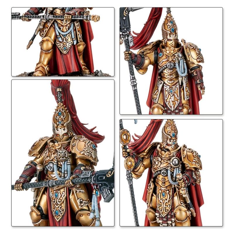Chaque Garde Custodien est couvert de détails, dont de l'iconographie sculptée et des filigranes, ce qui leur confère la majesté que l'on peut attendre des gardes du corps de l'Empereur. Un des Gardes Custodiens peut optionnellement remplacer sa lance gardienne par un vexillum du Magisterium. Le kit contient également 23 têtes interchangeables – 12 casquées et 11 nues – et 6 panaches interchangeables entre les casques, ce qui vous permet de personnaliser facilement vos guerriers légendaires.