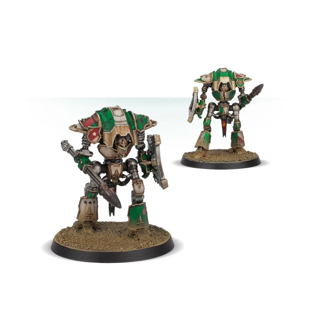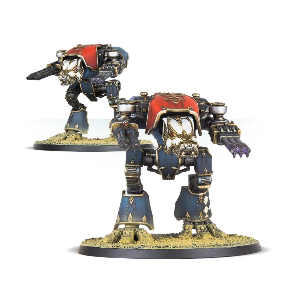 - 2 Titans éclaireurs Warhound. Ces modèles en plastique comportent chacun 62 éléments, dont plusieurs options d'armement. Chacun est fourni avec un socle rond de 80 mm.
