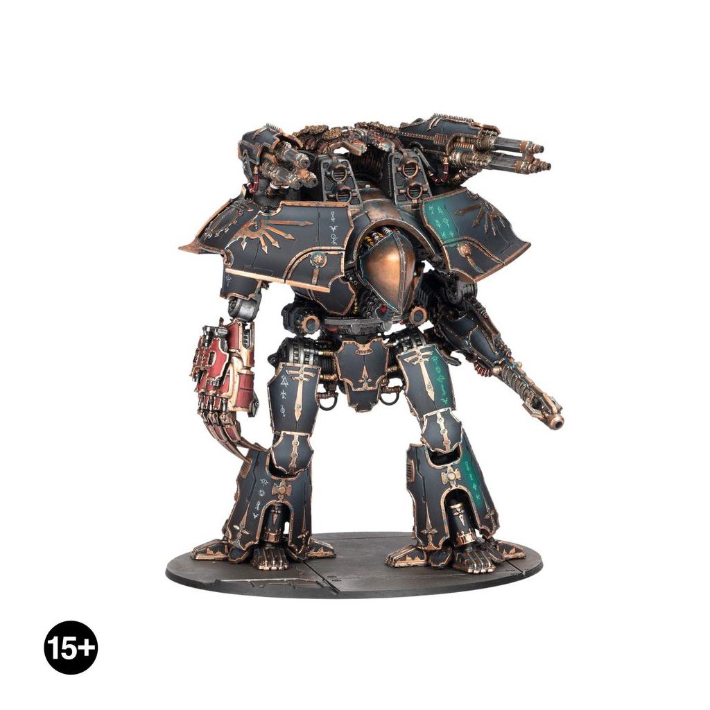 Ce kit en plastique et en résine permet d'assembler un Warlord-Sinister Psi-Titan à l'échelle epic. Variante ésotérique du Titan Warlord, cette machine divine emploie son Ciricrux Anima vertébral pour canaliser des énergies psychiques dévastatrices, tandis que son arme emblématique, le Sinistramanus Tenebrae, projette des éclairs d'ombre qui envoie ses ennemis dans les profondeurs du warp.