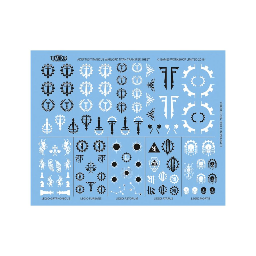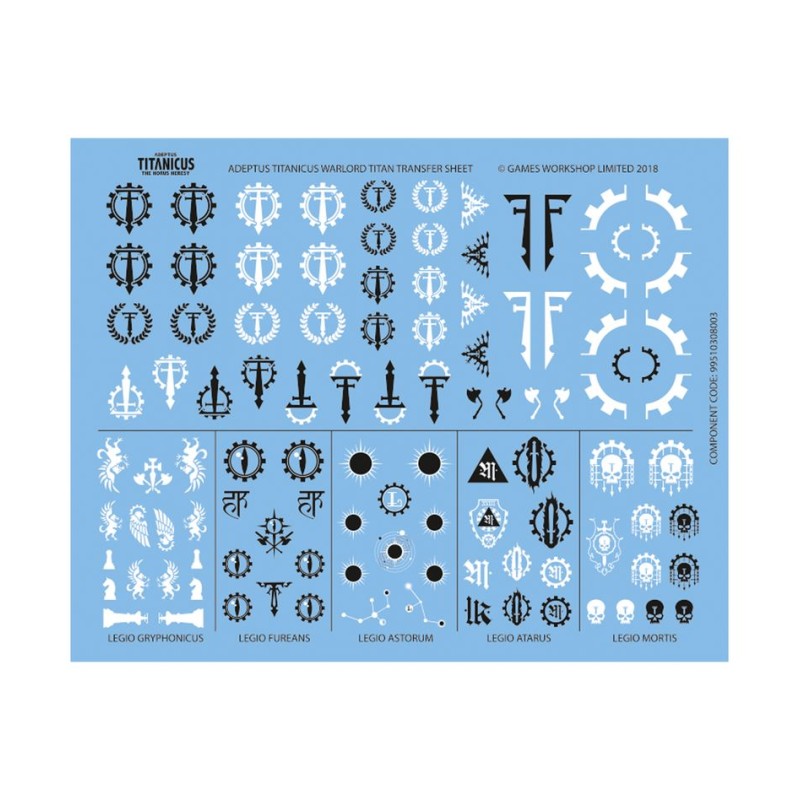 - 1x Planche de Décalcos de Titan Warlord Adeptus Titanicus