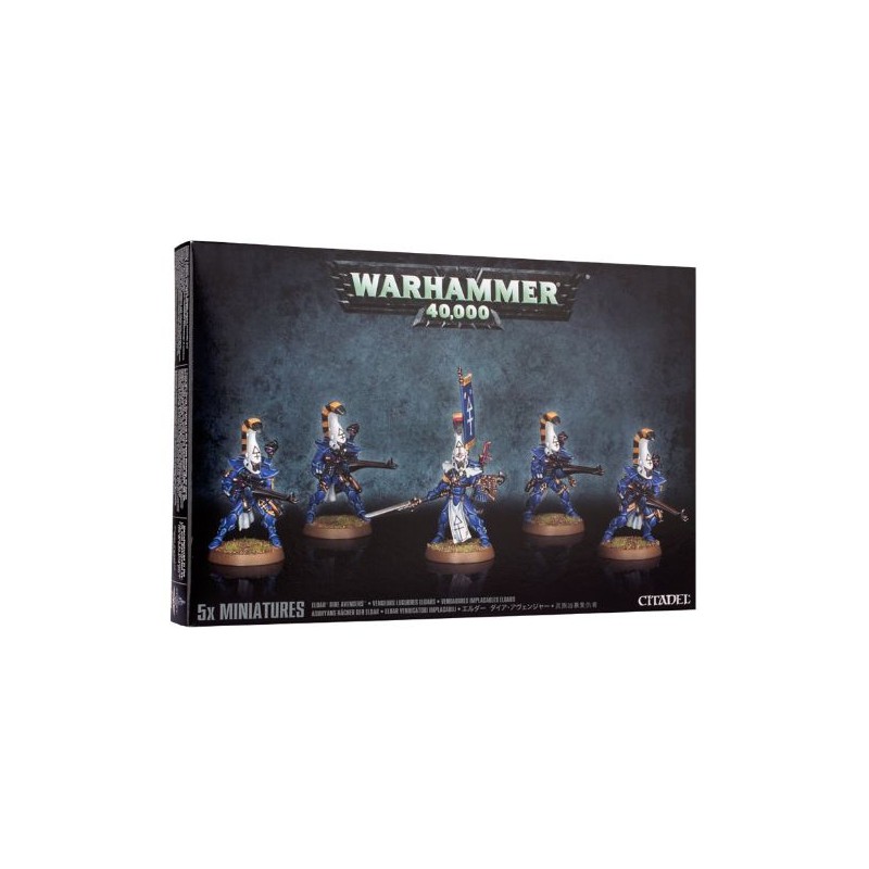 Les Dire Avengers de ce kit sont équipés de catapultes shuriken d'Avenger et de chargeurs de rechange. Vous trouverez les éléments optionnels pour réaliser un exarque pouvant être équipé au choix d'une catapulte shuriken, de deux catapultes shuriken, d'une lame funeste et d'un pistolet shuriken, ou d'une arme énergétique et d'un bouclier miroitant. Une bannière dorsale optionnelle vous permettra également de distinguer en un clin d'œil votre exarque, qui peut être tête nue ou porter un casque. Une statuette d'Asurmen est incluse sur la grappe.