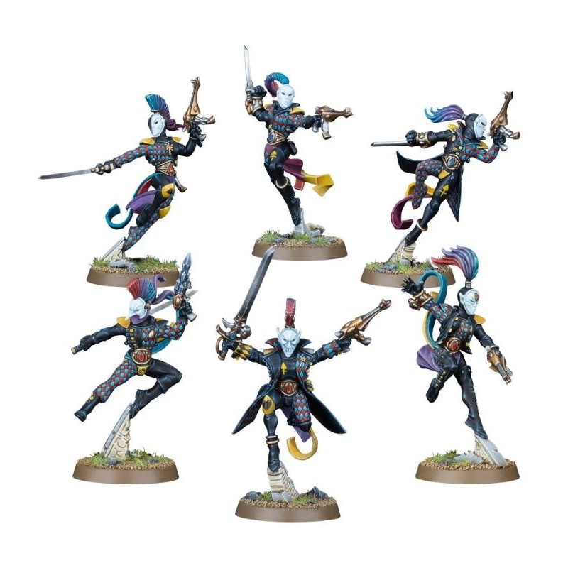 Ce kit plastique est composé de 80 pièces permettant d'assembler une Harlequin Troupe de 6 membres. Sont également fournis 6 socles ronds de 25mm et une planche de décalcomanies Harlequins.