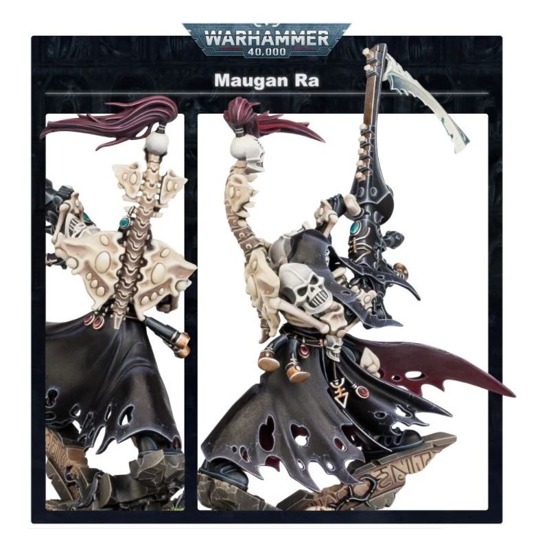 Ce kit permet d'assembler Maugan Ra, le Moissonneur des Âmes, armé du terrible canon shuriken nommé le Maugetar. Capable de donner le baiser de la mort à des lieues de distance ou de faucher des hordes d'ennemis telles des herbes hautes, Maugan Ra est un tourbillon silencieux de violence, la manifestation physique de l'inéluctabilité de la mort, et un puissant ajout à n'importe quelle armée d'Aeldari.