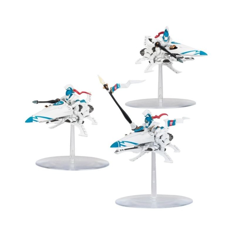 Description du produitLa mythologie des Aeldari est remplie de nobles héros qui ne font qu'un avec leur monture, et les Lances Étincelantes sont les manifestations de ces gloires légendaires. Ces Guerriers Aspects vivent pour la joute, qu’ils disputent à vitesse vertigineuse sur des motojets. Leur arme de prédilection est la longue et redoutable lance laser, qui perce la cible avec un puissant rayon un instant avant que l’arme la percute dans un choc dévastateur.