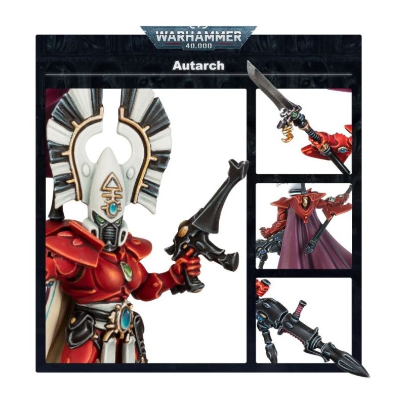 Ce kit permet d'assembler 1 Autarque, qui peut être personnalisé grâce à un large éventail d'options, afin que vous puissiez assembler un leader aeldari qui vous est propre et qui illustre les Voies de Guerriers Aspects qu'il a maîtrisées. Choisissez entre un vouge stellaire et une épée tronçonneuse de Scorpion pour le corps à corps, et déchiquetez vos ennemis avec un pistolet shuriken, un tisse-mort, un lanceur Faucheur, ou un fusil à fusion de Dragon, et si vous le souhaitez, donnez-lui un masque de Banshee Huante et un générateur de saut d'Araignée Spectrale. Les autres options de personnalisation incluent des têtes alternatives, un choix de torses, et une bannière dorsale. De plus, cette figurine est entièrement compatible avec les pièces du kit d'Autarque Ailé, vous offrant encore plus de combinaisons potentielles.