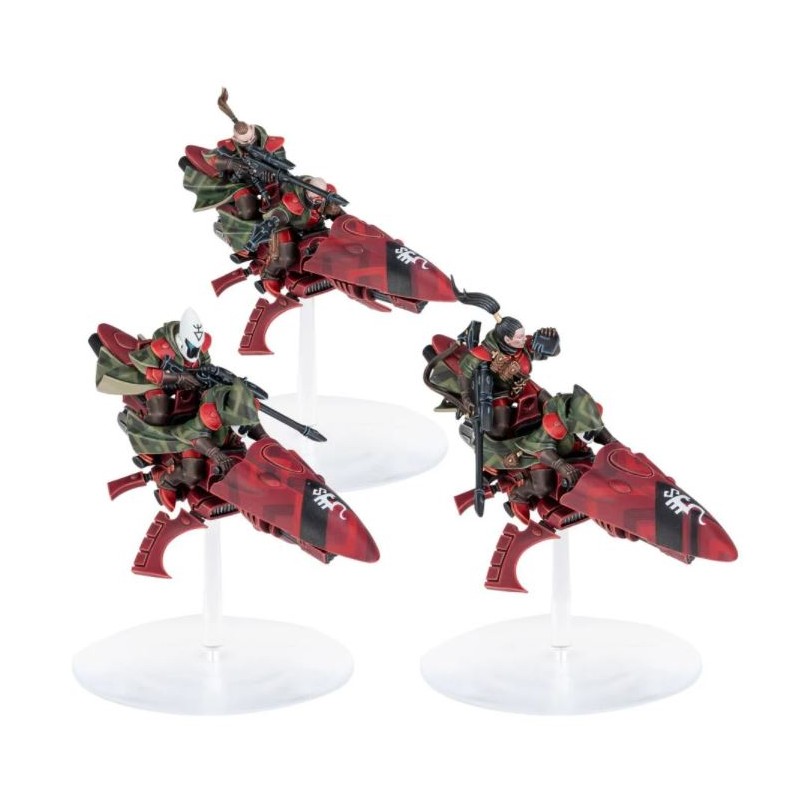 Ce set se compose de 100 pièces plastique, et est fourni avec 3x socles volants Citadel de 60mm, ainsi que 1x feuille de décalcos Aeldari qui inclut 369x décalcos. Ces figurines sont fournies non peintes et nécessitent assemblage