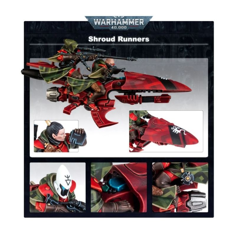 Ce kit permet d'assembler 3 Coureurs Mirages – des éclaireurs montés sur des motojets qui excellent dans la désorganisation des lignes ennemies avec leurs longs fusils de Ranger et leurs rayonneurs laser. Le kit inclut des options de poses alternatives pour le co-pilote et le pilote – le premier peut être assemblé en train de braquer un pistolet shuriken ou d'utiliser des jumelles, et le second peut être assemblé en train de viser avec son pistolet shuriken ou de lancer un mouchard aeldari tout en manœuvrant sa motojet. Le kit inclut également une sélection de 4 casques de Ranger, 3 têtes nues masculines et 2 têtes nues féminines.