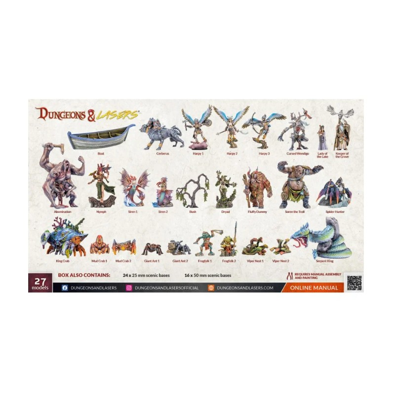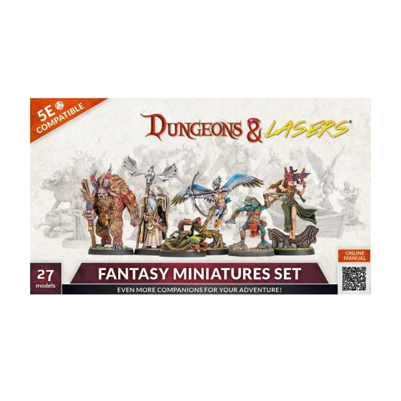 La boîte "Dungeons & Lasers - Décors - Fantasy Miniatures Set" contient 27 figurines à assembler et à peindre.