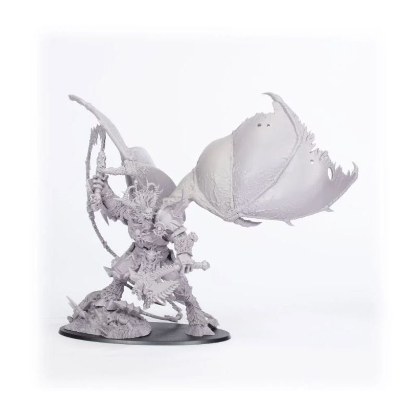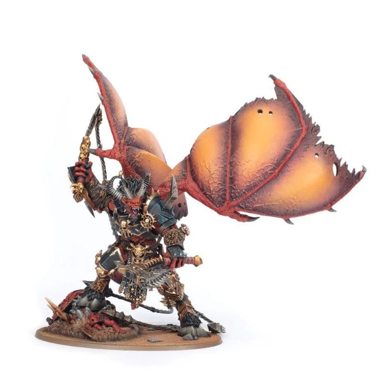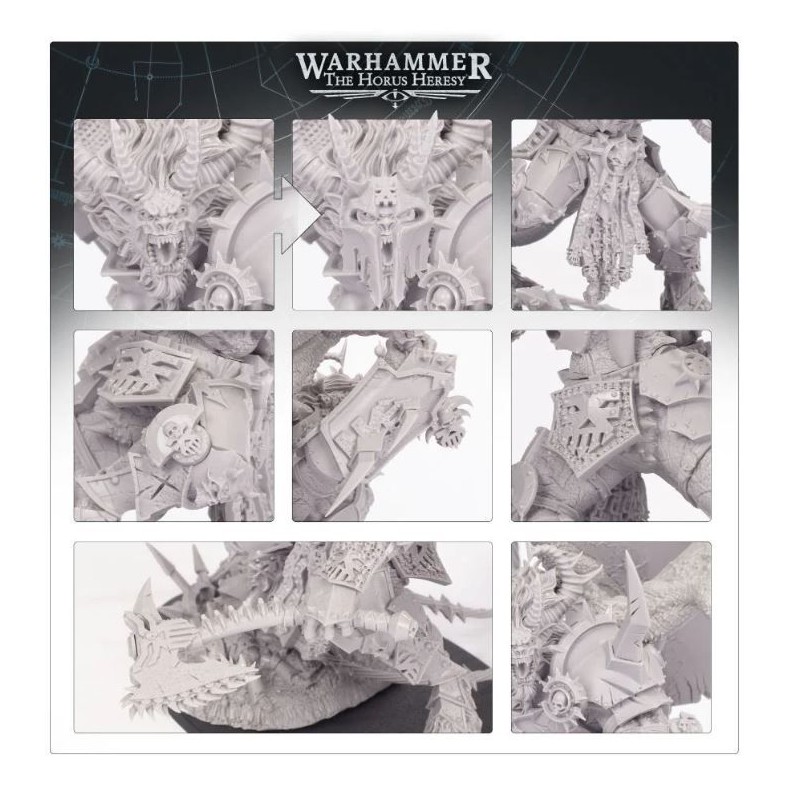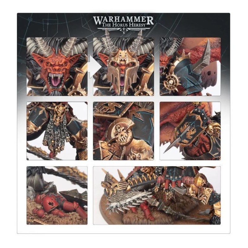 Ennemi juré de la IXe Légion, Ka'bandha est l'un des démons les plus féroces jamais rencontrés par l'humanité. Armé d'une hache et d'un fouet démoniaques ornés, il a taillé un chemin sanglant parmi les fils de Sanguinius. De son visage infernal à son armure de bronze brutale et ses vastes ailes, Ka'bandha est un parangon de fureur atavique - et un merveilleux projet pour les peintres qui veulent créer une pièce maîtresse époustouflante pour leurs forces Warhammer : L'Hérésie d'Horus. Il peut être assemblé avec un casque démoniaque ou une tête nue et hargneuse. Sous l'un de ses puissants sabots se trouve un tas de gravats, un cadavre d'Astartes et un cuirassé Léviathan en ruines appartenant à la Légion des Blood Angels.