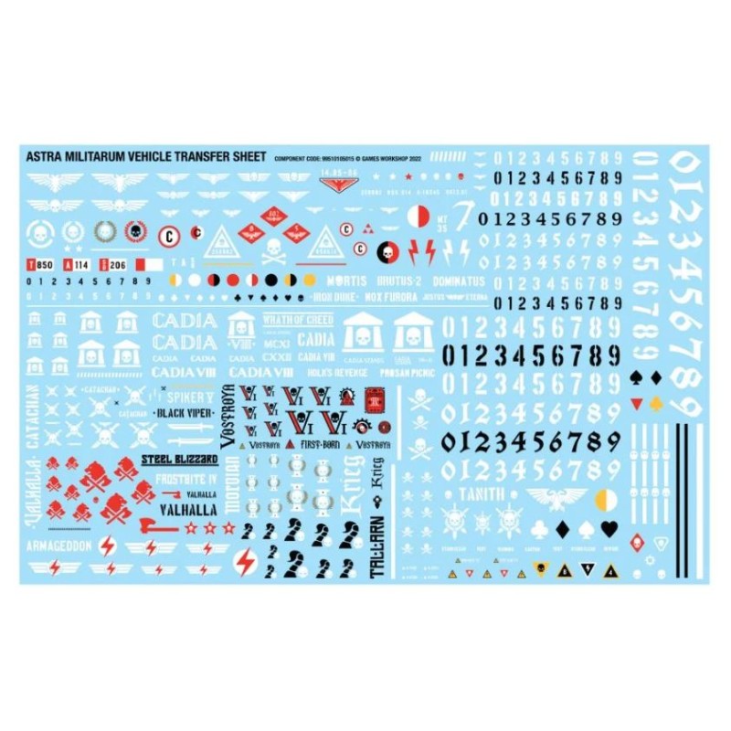 Ce kit est composé de 150 éléments en plastique et contient également une planche de décalcomanies de Véhicules de l'Astra Militarum avec 475 décalcos proposant des numéros, des symboles et diverses héraldiques régimentaires. Cette figurine est fournie non peinte et nécessite assemblage