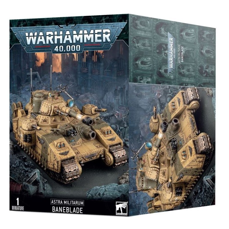 Ce kit plastique gargantuesque permet d'assembler un Baneblade super-lourd, un char tonitruant transportant un véritable arsenal et capable d'encaisser des tirs qui pourraient raser une armée entière. Si vous cherchez un pilier autour duquel articuler une puissante colonne blindée, un char super-lourd est un bon choix qui peut dévaster vos ennemis et encaisser une incroyable quantité de tirs, épargnant ainsi le reste de votre armée. Il est armé d'un puissant canon Baneblade et d'un autocanon coaxial en tourelle, ainsi que d'un canon Demolisher à l'avant de la coque, de deux canons laser sur les tourelles de flanc, d'un bolter lourd jumelé sur la tourelle de l'avant de la coque et de deux lance-flammes lourds jumelés sur les tourelles latérales et d'une mitrailleuse sur pivot sur la tourelle. Les lance-flammes lourds peuvent être remplacés par deux autres bolters lourds jumelés, et des tourelles latérales supplémentaires peuvent être ajoutées, équipées de canons laser additionnels et au choix de lance-flammes lourds jumelés ou de bolter lourds jumelés. Ça fait BEAUCOUP de puissance de feu.