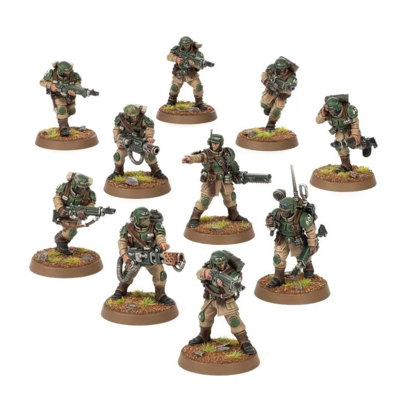 Ce kit est composé de 131 éléments en plastique et est fourni avec 10x socles ronds Citadel de 25 mm. Il contient également une Planche de Décalcomanies d'Infanterie de l'Astra Militarum avec 597 décalcos proposant des numéros, des marquages d'escouade et l'héraldique régimentaire cadienne. Ces figurines sont fournies non peintes et nécessitent assemblage.
