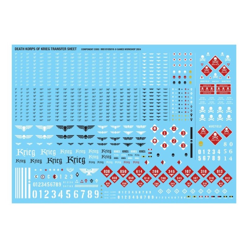 Ce kit est composé de 803 éléments en plastique, de 1x Socle Rond Citadel de 32mm, de 17x Socles Ronds Citadel de 25mm, de 5x Socles Ovales Citadel de 60x35,5mm, de 3x Socles Ronds Citadel de 50mm et de 1x Planche de Décalcos du Death Korps de Krieg proposant 803 décalcos de grande qualité pour décorer vos figurines.