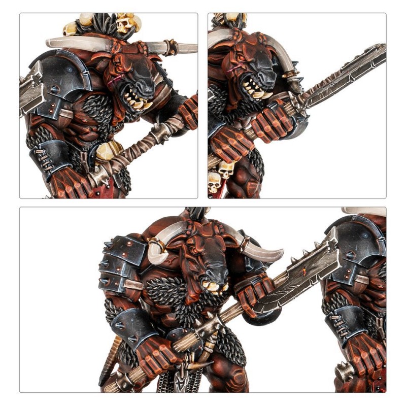 Ces gigantesques brutes peuvent être équipées d'une arme lourde, d'une paire d'armes de base, ou d'une arme de base et d'un bouclier pour plus de résistance. Vous trouverez aussi les éléments nécessaires pour assembler un champion, un porte-étendard et un musicien (tous optionnels). Le porte-étendard a un choix de deux bannières différentes, et les six paires de cornes, les cinq têtes, les cinq crinières, ainsi que les armes et boucliers du kit sont interchangeables, ce qui permet de personnaliser facilement vos unités.