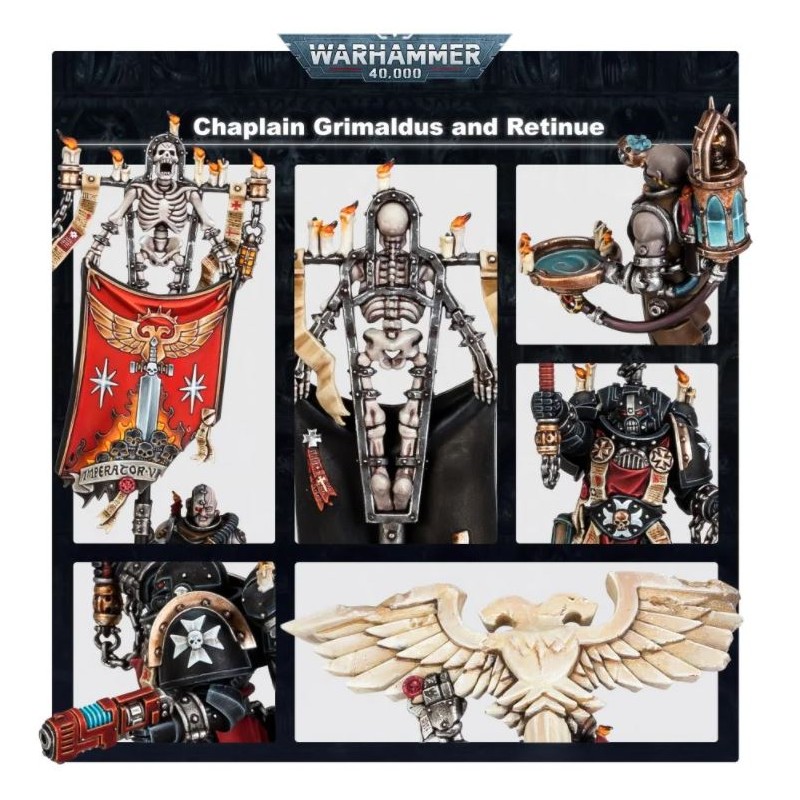 Armé d'un pistolet à plasma et d'un crozius d'artificier, Grimaldus va au combat pour châtier les psykers ennemis. Il est accompagné d'une procession de servitors qui incitent les Black Templars à accomplir des hauts faits d'héroïsme et de dévotion pour gagner la faveur de l'Empereur.