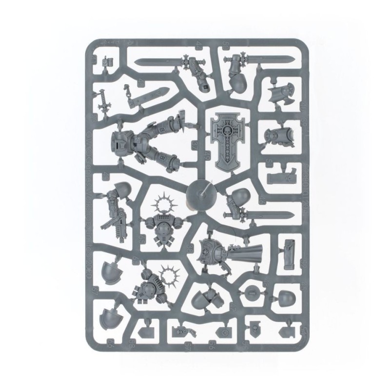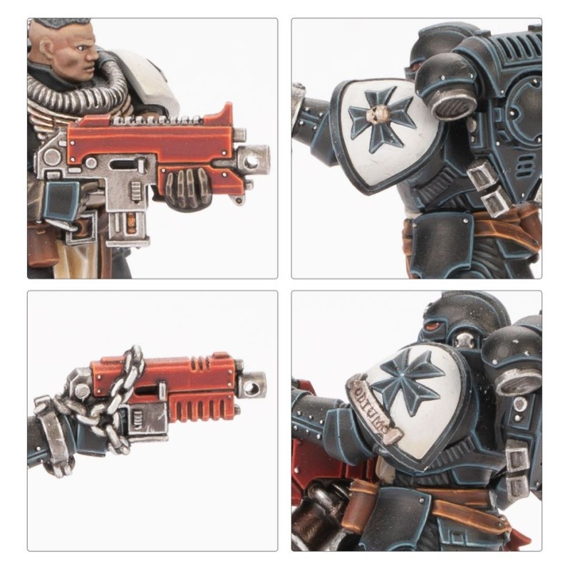 L'Escouade Crusader comprend quatre Novices équipés au choix d'armes à feu de Novices ou de pistolets bolters et d'épées tronçonneuses. Les six Initiés peuvent être armés d'un fusil bolter, ou d'un pistolet bolter lourd et d'une épée tronçonneuse. Deux Initiés peuvent être armés d'un pyro-éclateur, et deux d'un pistolet bolter lourd et d'un gantelet énergétique. Un des Initiés peut être assemblé comme un Frère d'Épée optionnel, doté d'une arme énergétique de maître et d'un pistolet bolter lourd ou d'un pyropistolet. Les têtes et les épaulières sont interchangeables entre les Initiés, et ils disposent aussi de sceaux de pureté, d'écussons et de reliques optionnels.