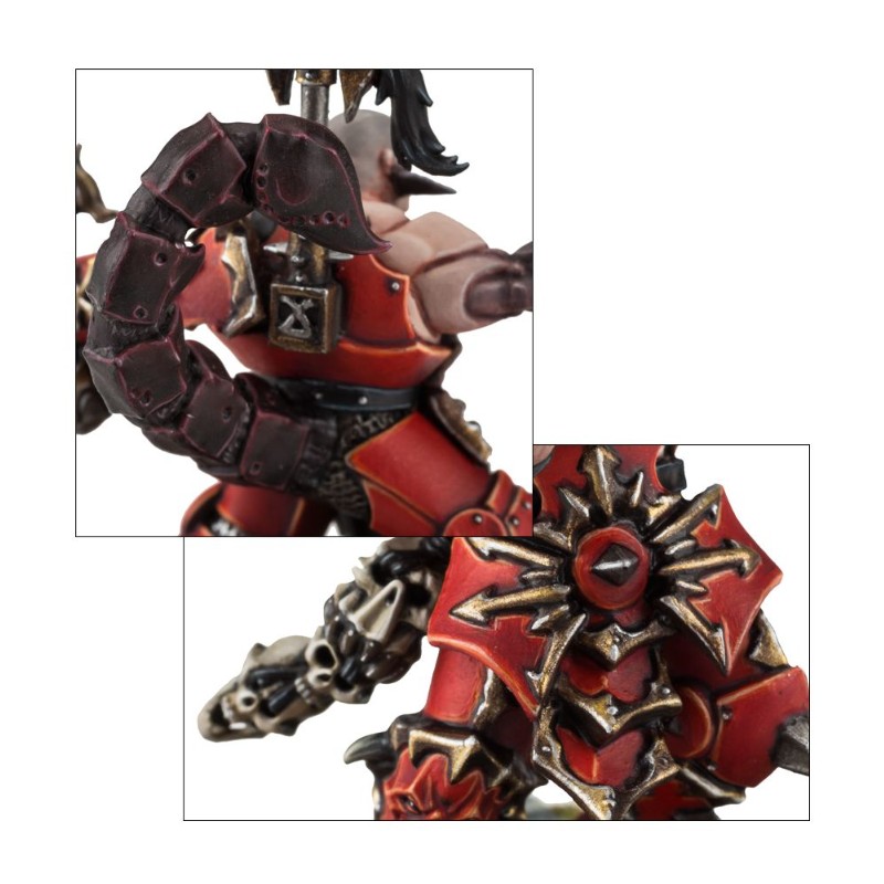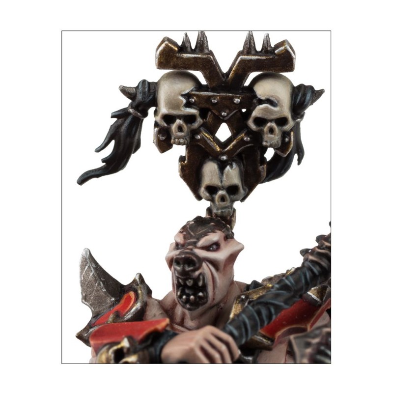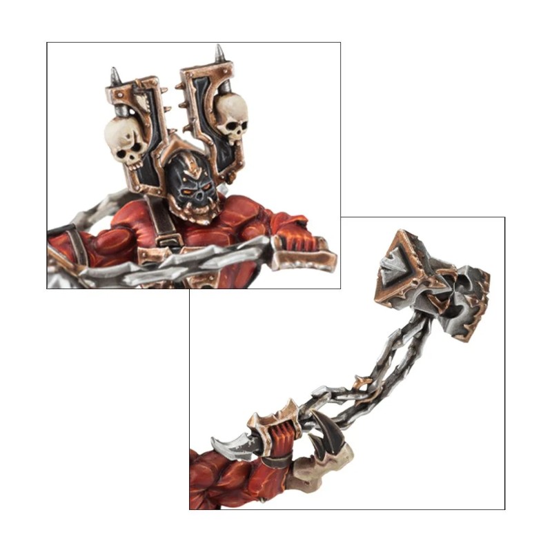 Il y a aussi sept têtes nues au choix, avec diverses mutations: cornes, front clouté et même faciès canin. Chaque Skullreaper porte un râtelier à trophées dorsal, et le champion se reconnaît à son double râtelier.