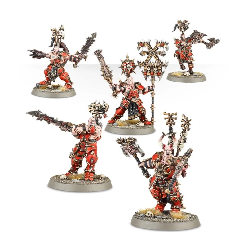 Ce kit plastique permet d'assembler au choix cinq Khorne Wrathmongers ou cinq Khorne Skullreapers. Il y a cinq paires de jambes en armure (dont l'une a la morphologie des jambes d'un sanguinaire) et un assortiment de 10 torses pour servir de base au reste des figurines. Vous pouvez ensuite choisir entre 10 cuirasses différentes à adapter aux torses, avec en plus des épaulières en option. Quel que soit le type d'unité que vous choisissez d'assembler, il y a assez de pièces pour inclure un champion et un porte-étendard.