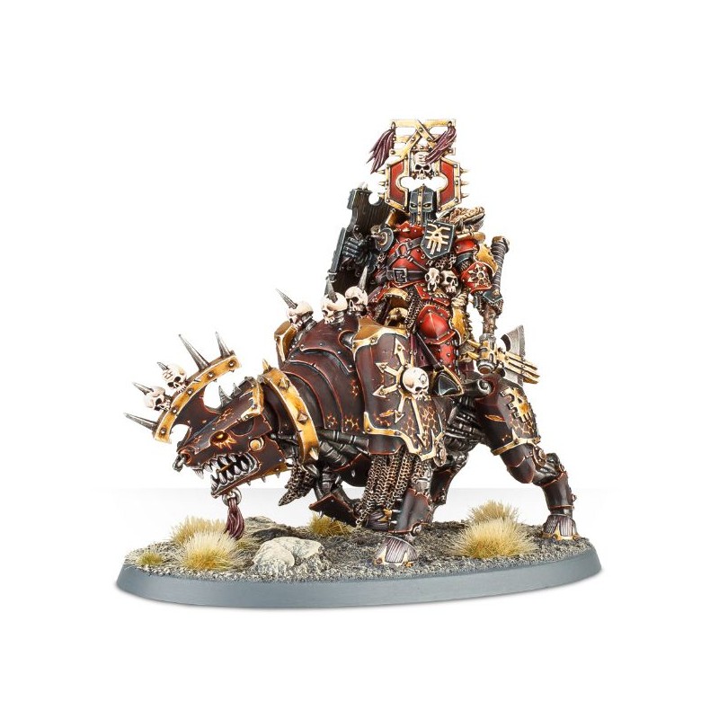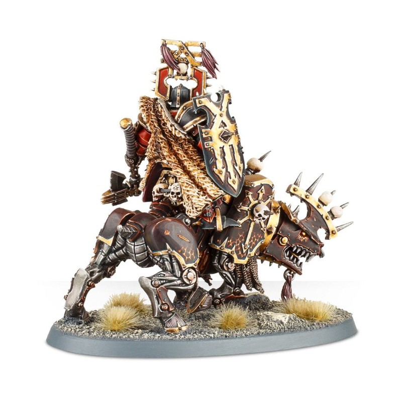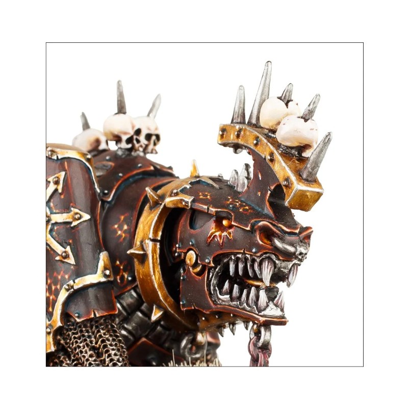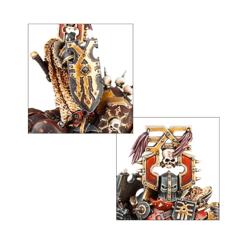 Description du produitLe Lord of Khorne sur Juggernaut est bardé de trophées de guerre. Il est revêtu d'une épaisse armure et est couvert de chaînes et de nombreux crânes. En outre, il porte un lourd bouclier et une hache monumentale, dont la lame est l'instrument de Khorne. Cette figurine à l'aspect brutal est sise sur le dos d'un juggernaut massif, qui est le reflet de son cavalier. La monture possède un collier d'airain ainsi qu'une crête pointue, sur laquelle deux crânes sont empalés. elle est recouverte d'épaisses plaques d'armure, et présente des pistons, des mailles et des lames. Monture et cavalier sont abondamment estampillés de l'iconographie de Khorne.