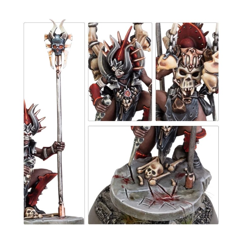 Ce kit plastique permet d'assembler une Ritualiste Saigne-royaume, une prêtresse de Khorne vouée à consacrer la terre par le sang. Portant un masque en forme de crâne et des vêtements rituels macabres, elle manie une dague rituelle apparemment faite d'os – tout aussi utile pour conduire des rites de sang et poignarder l'ennemi au cœur. Elle est représentée en train de monter sur un dais jonché de restes sacrificiels et couvert de dessins runiques, tout en brandissant son sceptre surmonté d'un crâne.