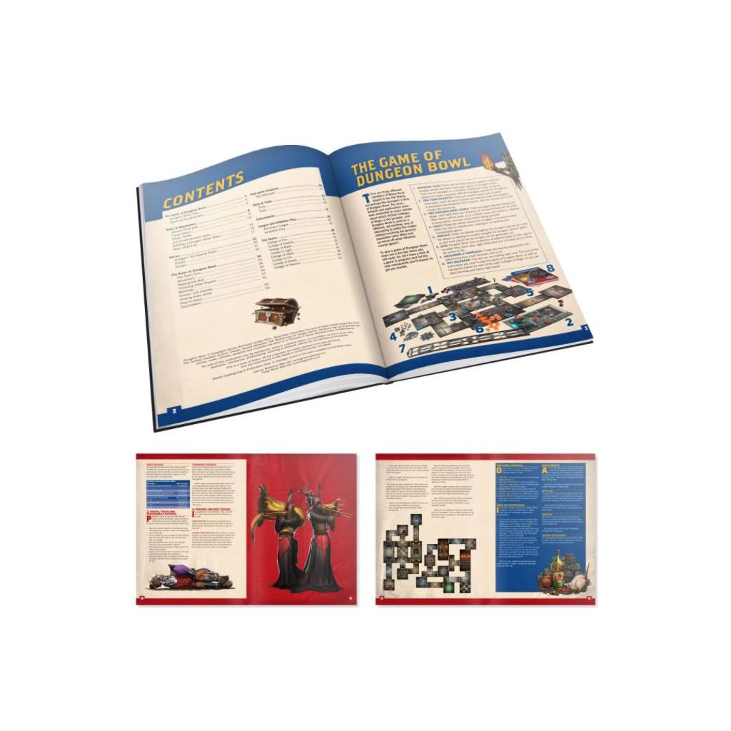 - Un livre de règles de 104 pages rempli d'illustrations de caractère du Dungeon Bowl et de toutes les règles dont vous avez besoin pour jouer au jeu, ainsi que des règles couvrant les matchs d'exposition et de ligue