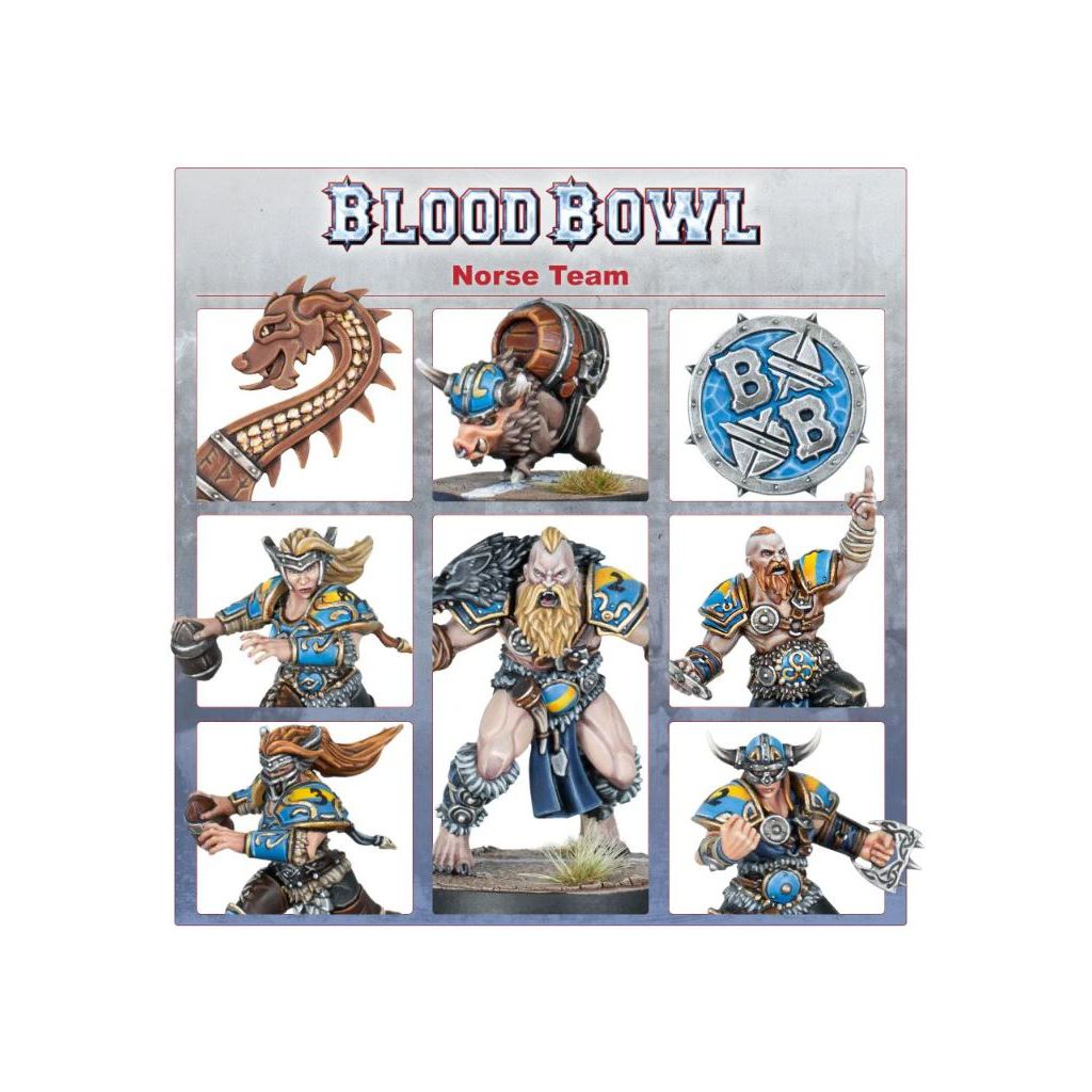 Ce kit se compose de 120 pièces plastique avec lesquelles vous pouvez assembler les Norsca Rampagers, une équipe nordique à utiliser lors de vos matchs de Blood Bowl. L'équipe se compose de 6 Norse Raider Linemen, 2 Beer Boar, 2 Norse Berserkers, 2 Ulfwereners et 2 Valkyries. Il inclut aussi 2 pièces Blood Bowl double face, 2 pions de tour et de relance, 4 ballons, et une feuille de 292 décalcos.