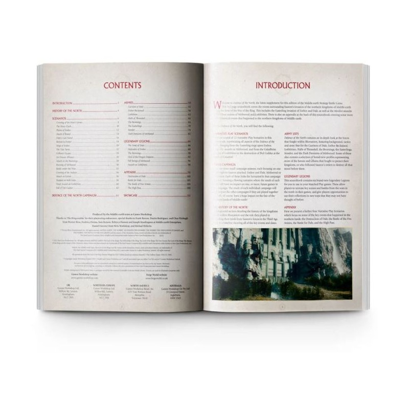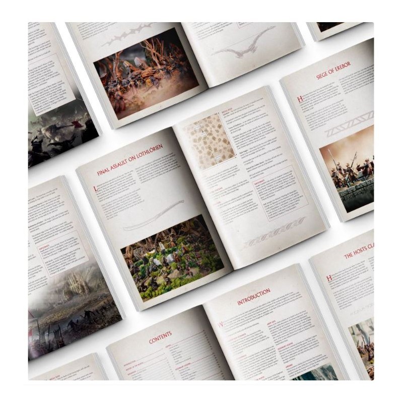 – Annexe : Fournit un contexte supplémentaire et quatre scénarios pour reconstituer des batailles historiques à travers le Rhovanion, y compris la Destruction de Dale, la Bataille de Dale, la Bataille des Cinq Armées et le High Pass.