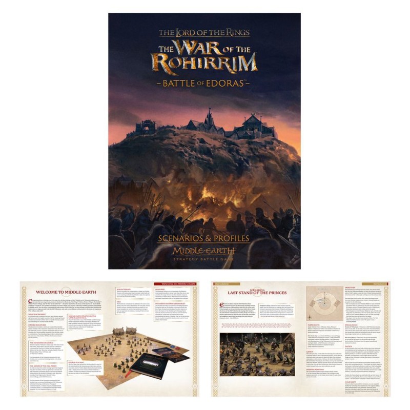 La boîte contient également un livret de 48 pages contenant tous les scénarios et profils dont vous avez besoin pour recréer la bataille d'Edoras avec vos figurines. Quatre scénarios vous permettent de jouer une mini-campagne liée - Le premier assaut, La chute des portes, Torcher la ville et Le dernier combat des princes. Pour obtenir les profils complets des unités, vous aurez besoin d'un exemplaire d'Armées du Seigneur des Anneaux, disponible séparément.