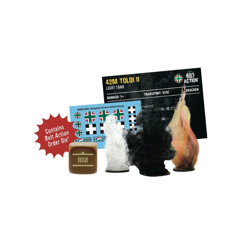 La boîte contient un char léger Toldi Iia de 42M, en résine et en métal, avec une feuille de décalcomanies, un dé d'ordre Bolt Action, une carte de statut de véhicule Bolt Action : Third Edition et des marqueurs de dégâts.