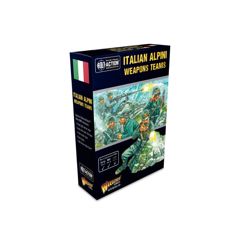 La boîte contient six figurines d'Alpini italiens en résine Warlord, trois dés d'ordre Bolt Action et des socles en plastique.