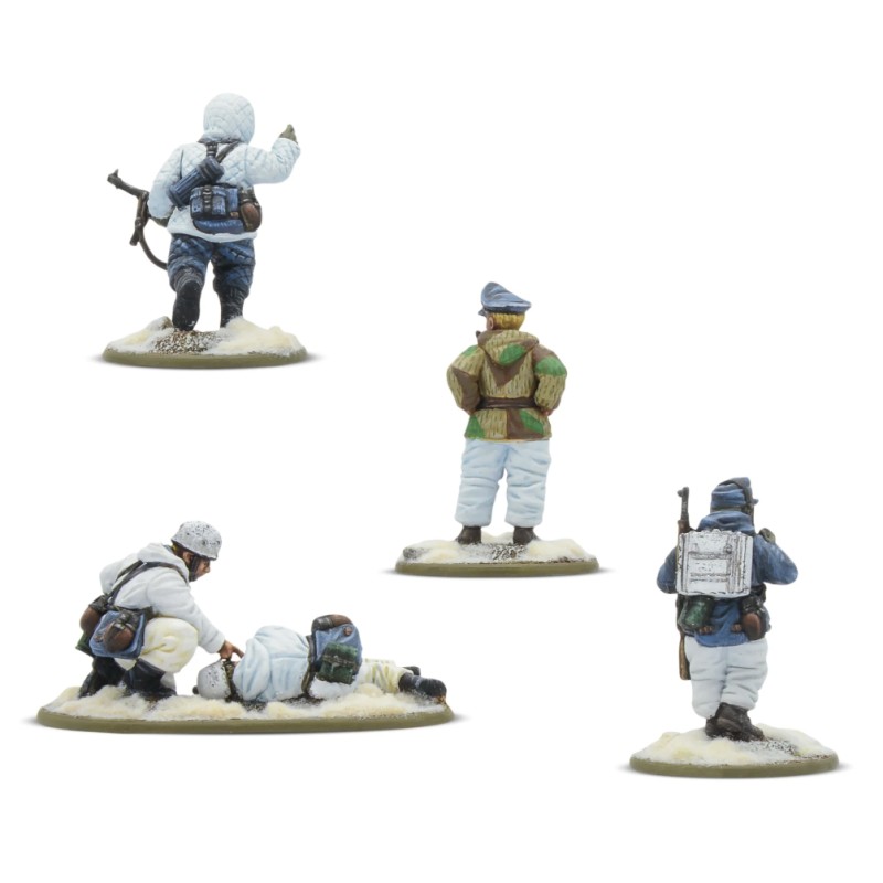 Contient quatre figurines de Fallschirmjäger (hiver) en résine Warlord et des socles en plastique.