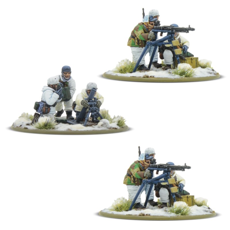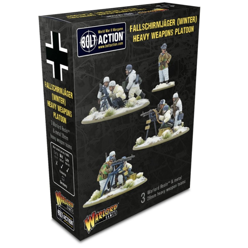 La boîte contient un officier Warlord Resin Fallschirmjäger (winter), deux mitrailleuses moyennes en métal avec trois membres d'équipage Warlord Resin Fallschirmjäger (winter) chacune et un mortier moyen en métal avec trois membres d'équipage Warlord Resin Fallschirmjäger (winter). Contient également quatre dés d'ordre Bolt Action et des socles en plastique.