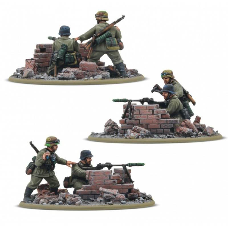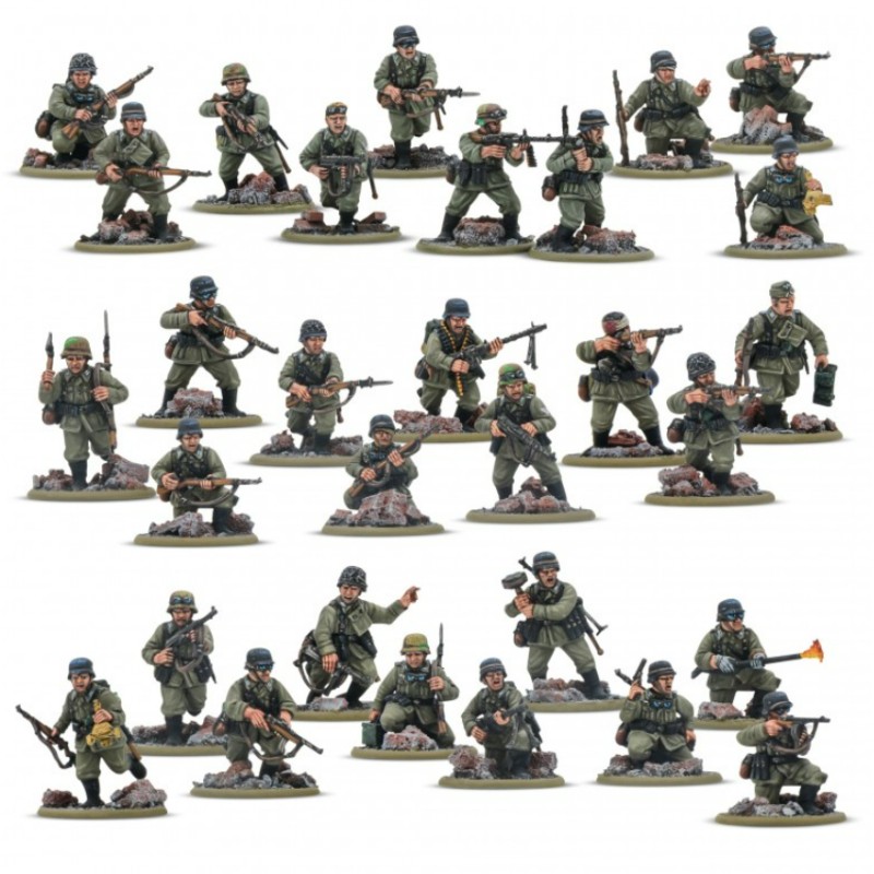 Cette boîte contient 30 modèles d'infanterie avec un large éventail d'armes et d'équipements, permettant de construire une grande variété de types de troupes de toutes les périodes et de tous les théâtres de la Seconde Guerre mondiale auxquels les Allemands ont participé. Chaque cadre comprend des fusils Kar 98, des mitraillettes MP40 et des mitraillettes russes capturées, un Luger et un pistolet lance-flammes, deux mitrailleuses légères MG34 avec des boîtes de munitions, un lance-grenades GrB-39, un fusil antichar et un lance-flammes ! De nombreuses options de coiffure, comme les casques, les têtes nues et les casquettes d'officier de campagne, sont incluses, et il y a de nombreux accessoires pour les types de troupes spécialisées et les commandants. Vous recevez également trois socles ronds de 60 mm, permettant d'assembler des équipes de mitrailleuses moyennes et d'autres armes. Des sections de murs et des briques sont également incluses, parfaites pour ajouter des détails caractéristiques aux socles de figurines et créer des dioramas.