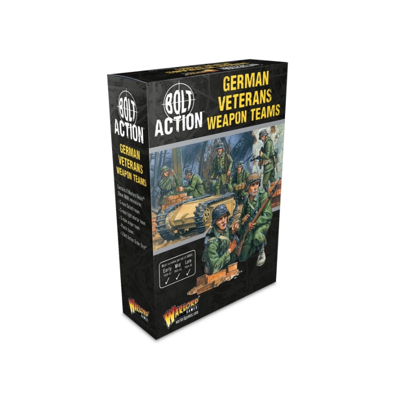 Cette boîte vous fournit trois équipes d'armes pour soutenir votre infanterie de vétérans allemands, équipées pour les combats rapprochés. Une équipe de tireurs d'élite menace les officiers et observateurs ennemis, tandis qu'une équipe de mortiers légers effectue des tirs indirects à courte portée pour soutenir vos pelotons de fusiliers. Enfin, la mine télécommandée Goliath, unique et puissante, peut être déployée pour démolir les fortifications les plus solides.
