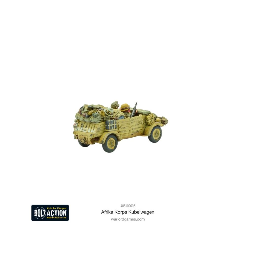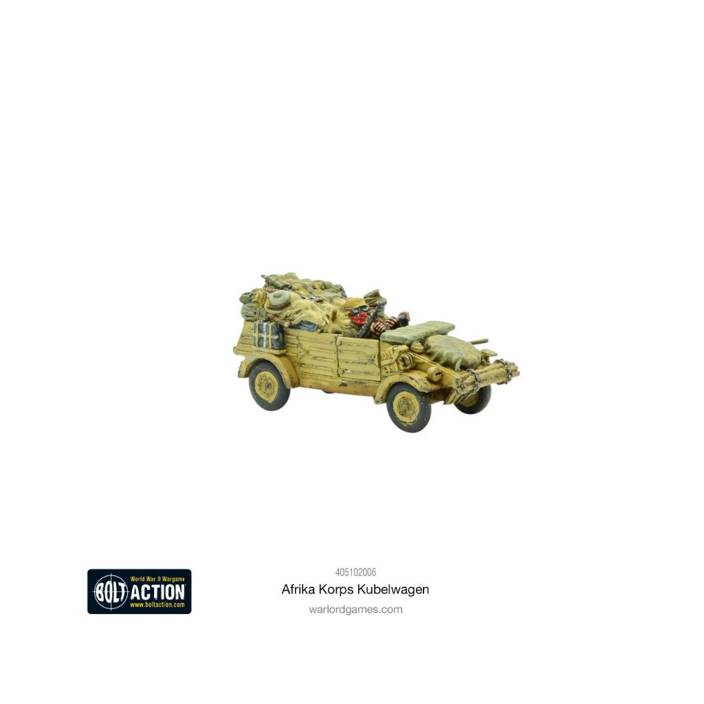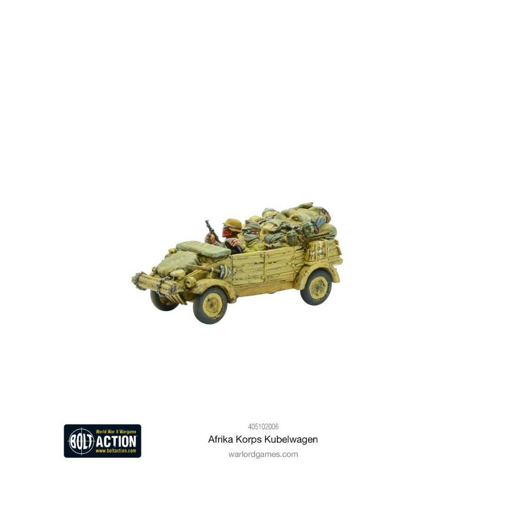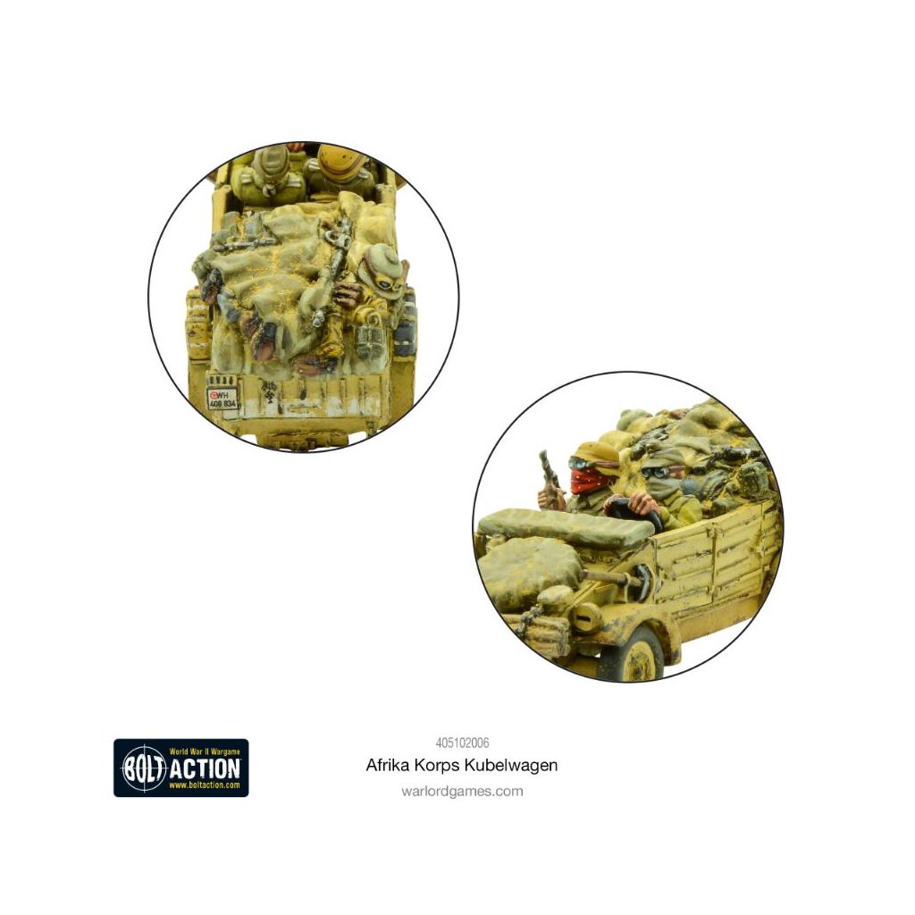 Cette Kubelwagen de l'Afrika Korps est équipée de pneus "ballon" plus larges, utilisés dans les étendues ouvertes des déserts pour éviter de s'enliser dans le sable, et est remplie de matériel de rangement et d'équipement pour aider à survivre dans les environnements les plus difficiles.