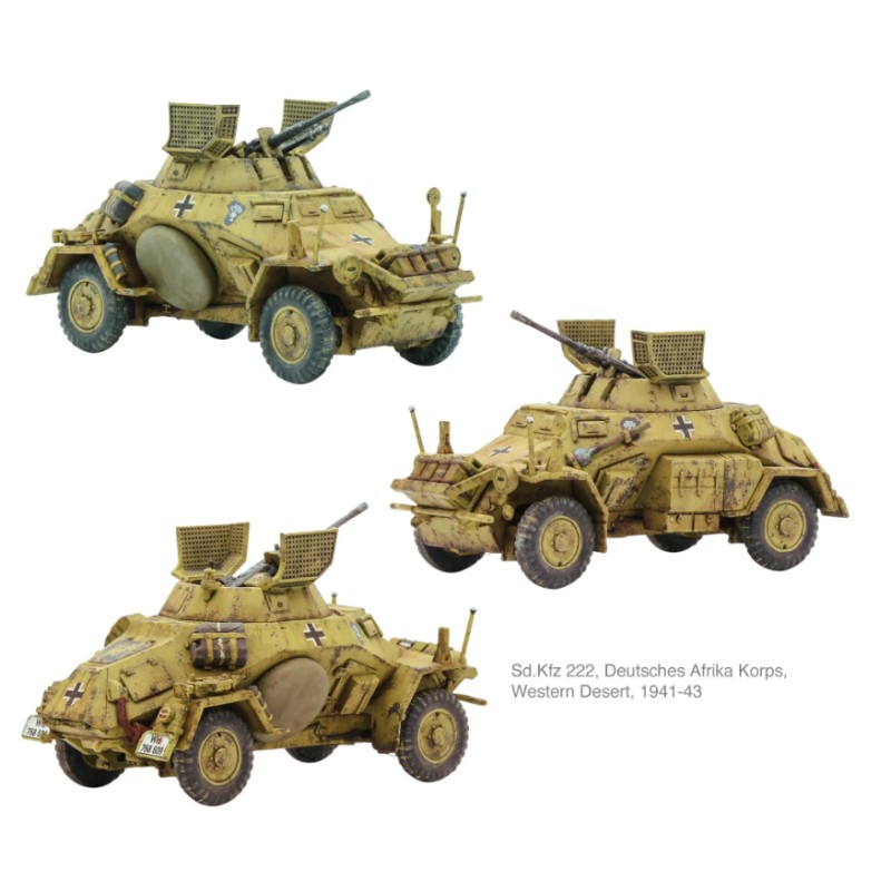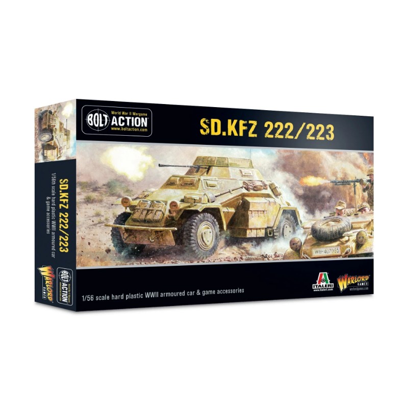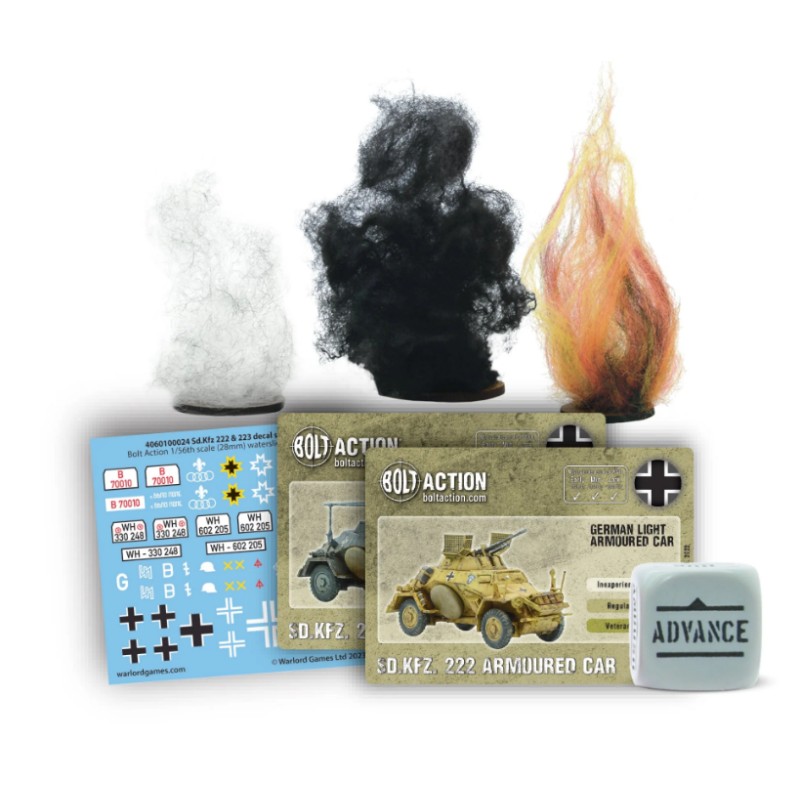 Comprend un modèle en plastique qui peut être construit comme un Sd.Kfz 222 ou un Sd.Kfz 223, des dés d'ordre Bolt Action, une carte de statut Bolt Action, des marqueurs de dommages aux véhicules, un livret d'assemblage et une feuille de décalcomanies à l'eau en couleur couvrant les véhicules allemands, roumains, bulgares et de la Chine nationaliste.