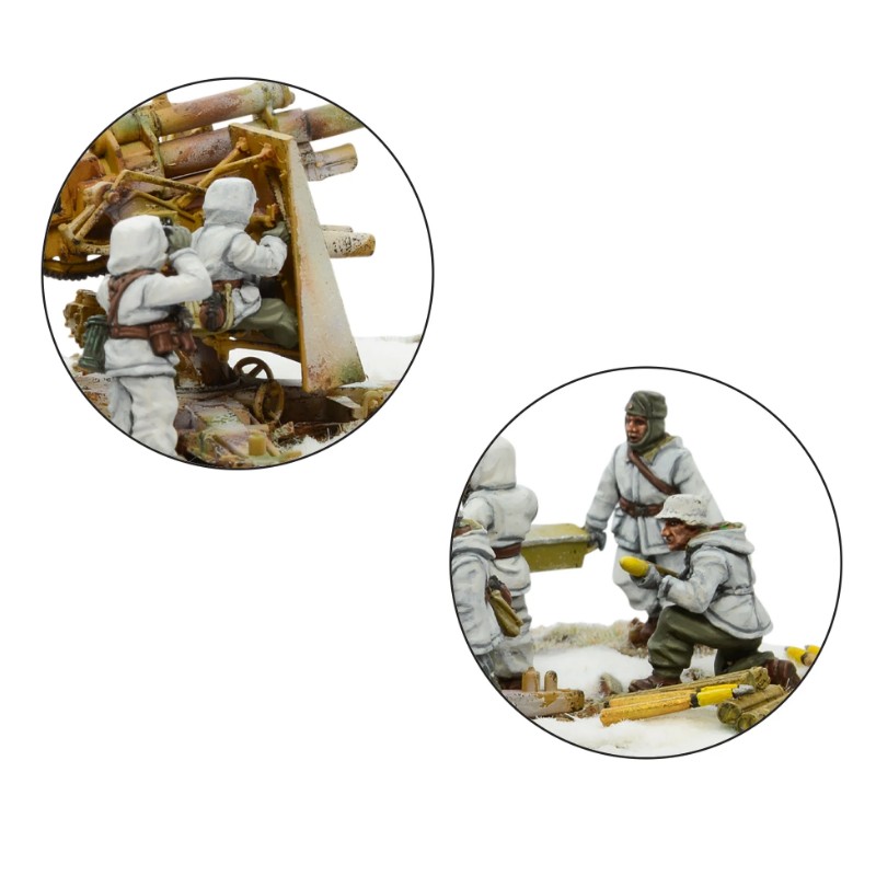 Contient une Flak 37 en plastique, sept figurines d'équipage allemandes Heer (Hiver) en métal, un socle en MDF et des accessoires de jeu.