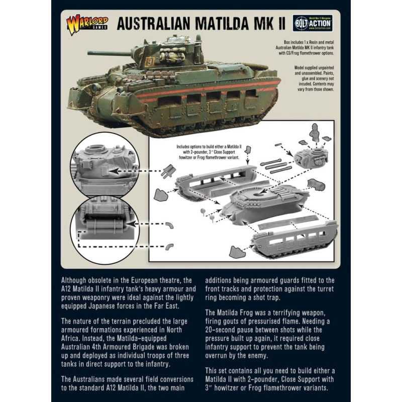 Bien que la Matilda soit rapidement devenue obsolète sur le théâtre européen, l'armure lourde et l'armement éprouvé se sont révélés parfaits pour être utilisés contre les Japonais légèrement équipés.