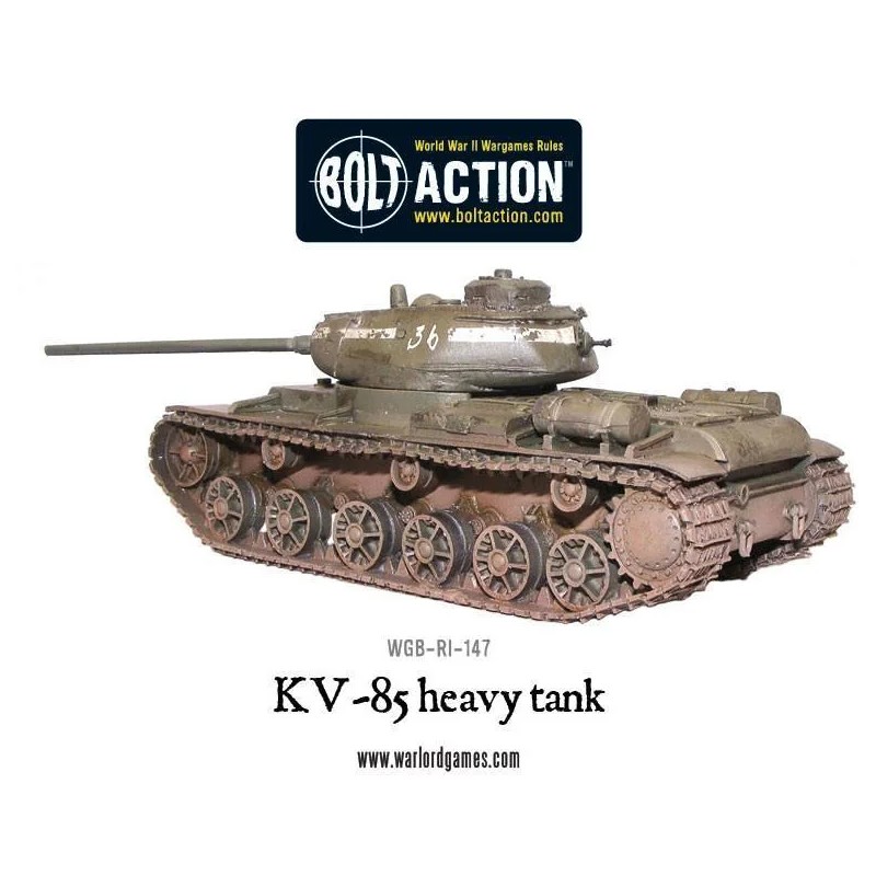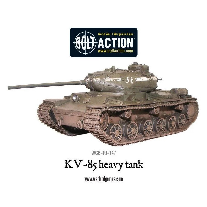 La boîte contient un char lourd KV-85 en résine et métal, des dés de commande Bolt Action, des décalcomanies à l'eau, une carte de statistiques Bolt Action: Third Edition et une carte de données et des jetons de char Achtung Panzer!.