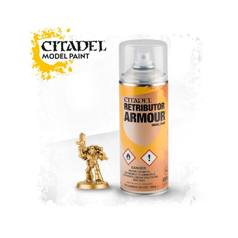 Description du produitL'aérosol Retributor Armor est une étonnante peinture or en bombe qui vous permet d'appliquer rapidement et facilement une couche de base uniforme sur vos figurines. C'est exactement la même couleur que le Retributor Armour en pot. Ses pigments de la plus haute qualité assurent une finition homogène, lisse et éclatante, qui feront briller vos figurines dans toutes les salles de jeu.