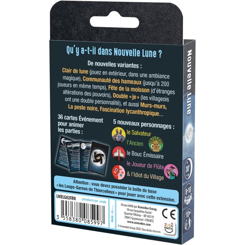 Les Loups-Garous de Thiercelieux – Nouvelle Lune est une extension du jeu d’ambiance Les Loups-Garous de Thiercelieux qui ajoute des cartes Événement modifiant les règles à chaque tour.