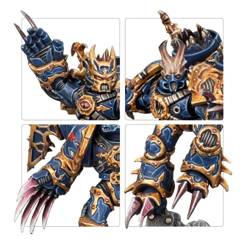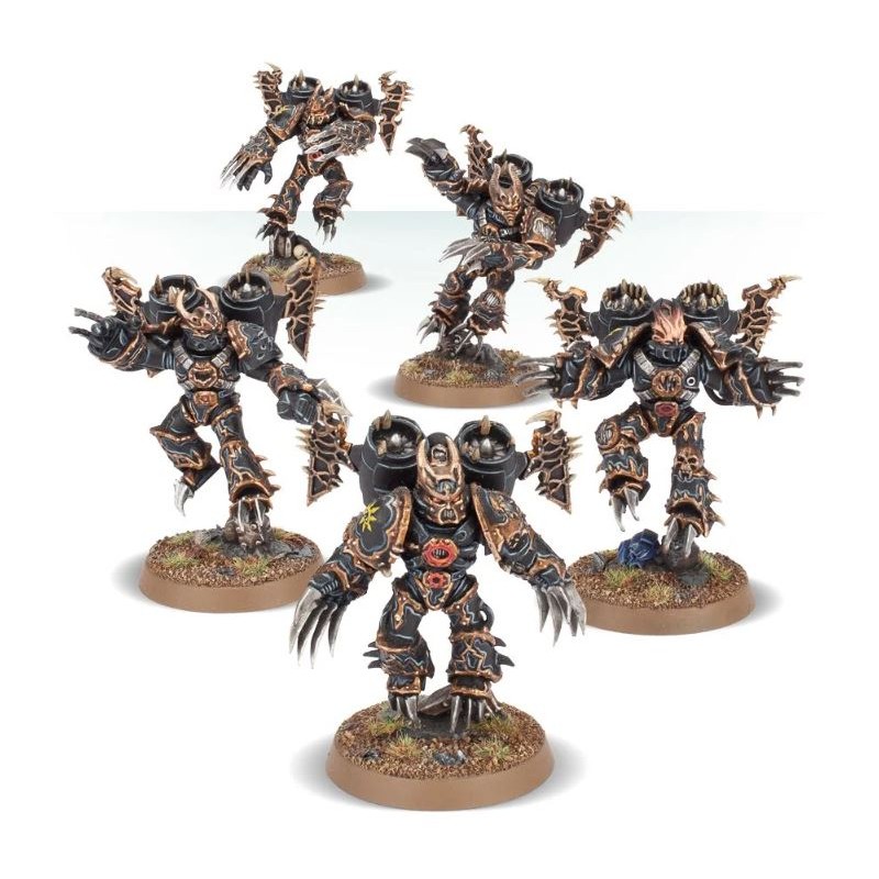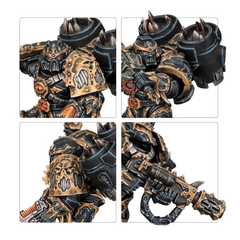 Les Warp Talons arborent des attributs barbares comme des griffes Lightning en forme de serres, des casques cornus, et des ailes sur leurs réacteurs dorsaux. On les voit perchées ou en train de décoller parmi les débris du champ de bataille. Leurs armures aux arêtes de métal présentent tous les effets corrupteurs du Warp: grilles ouvertes dans les épaulières; câbles qui dépassent des plaques d'armure; crocs crevant diverses surfaces et bordant les tuyères des réacteurs dorsaux. Ces figurines saisissantes ne demandent qu'à rejoindre n'importe quelle collection de Chaos Space Marines.