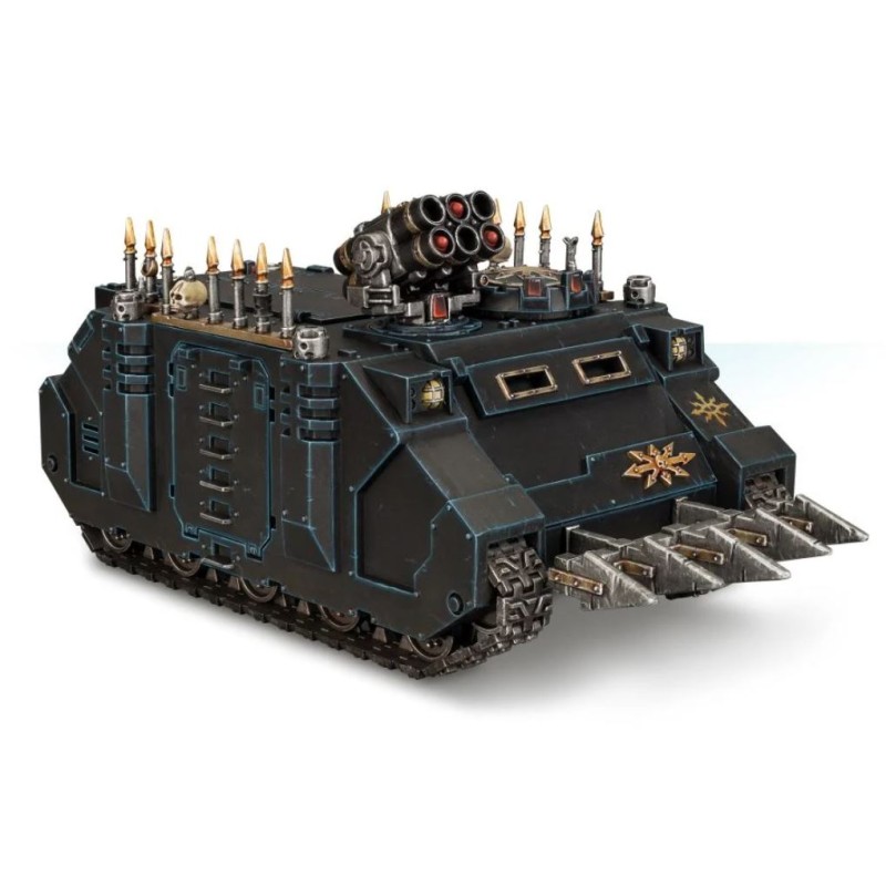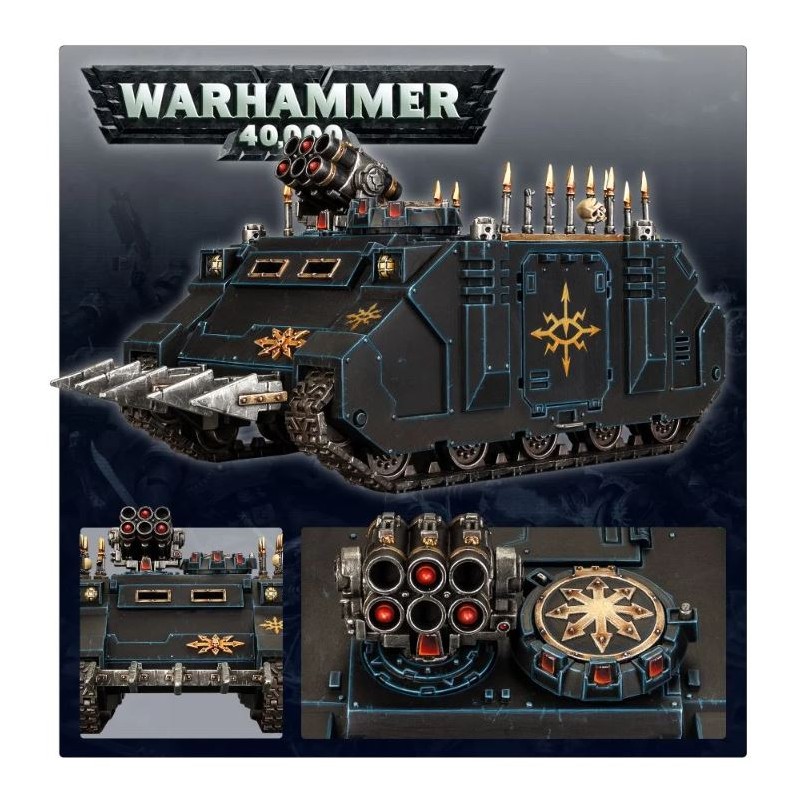 Ce kit contient tout le nécessaire pour monter un Chaos Rhino. Vous aurez l'option de l'équiper avec diverses armes, dont une arme combinée ou un combi-bolter. Ce kit est fourni avec une grappe d'accessoires tels que rails à pointes et symboles du Chaos, avec de nombreuses pièces en plus pour agrémenter vos autres figurines du Chaos.